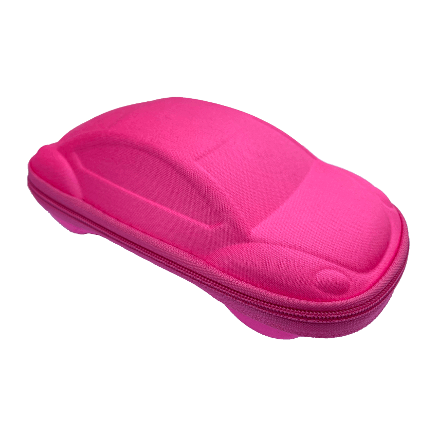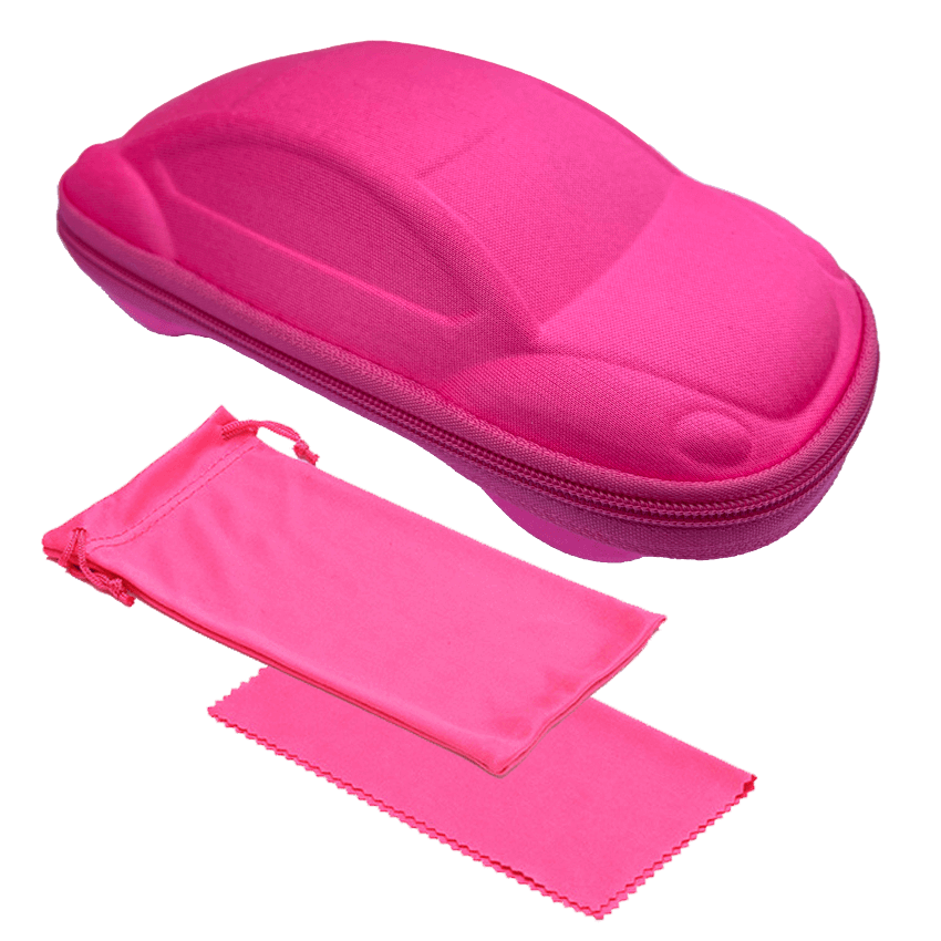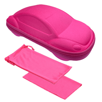 Gode solbriller krever flotte etuier! Dette superflotte settet inneholder både etui, oppbevaringspose i tøy og en praktisk pusseklut. Lær barnet ditt å ta vare på solbrillene ved å gi han eller henne et beskyttende etui formet som en rosa bil!